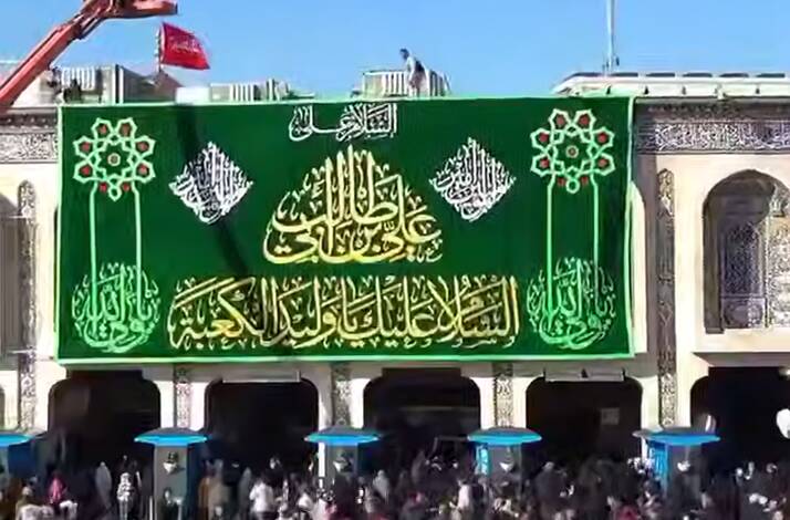 فیلم/ نصب پرچم ولادت امیرالمؤمنین در بین الحرمین