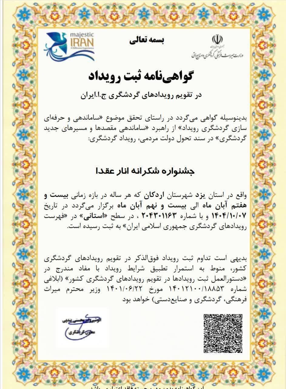 ثبت رویداد «جشنواره شکرانه انار عقدا» به عنوان سومین رویداد اردکان در فهرست تقویم گردشگری کشور